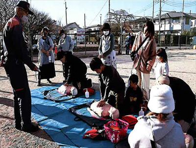 ⑤応急救護AED訓練:起震車による地震体験をはじめ救護訓練・消火訓練など総計200人が参加しました。疲れたー! |