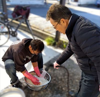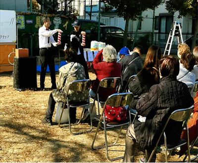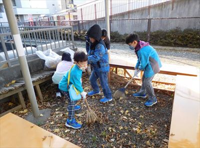 ⑤三世代交流冬の集いの開始前にイチョウの落葉拾いをしているところ |