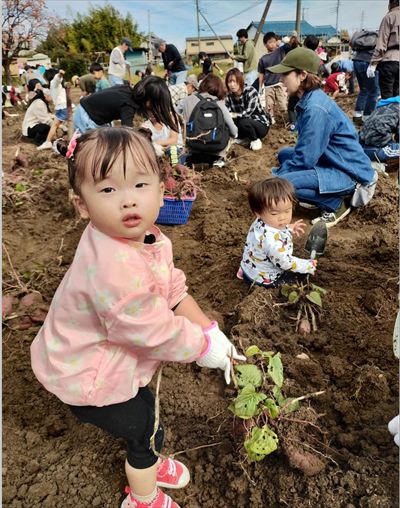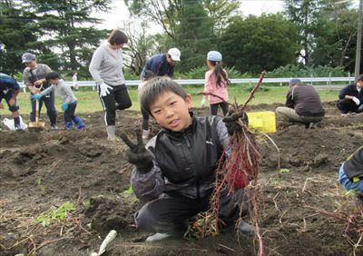 ⑤近隣の親子が大勢参加され、子供たちは手でイモを掘りながら現れたイモに目を輝かせて歓声を上げていました。なお収穫されたイモは、参加者等へのお土産、社会福祉協議会の「ココナツ便(ひとり親家庭の支援事業)」への寄付並びに安価販売と、地域の福祉の一助としても貢献しております。 |