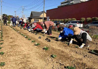 ⑤ 川久保自治会管理のお花畑に、メンバー19人でパンジー苗400本植えの様子。(外国人親子4人含み、国際交流!) |