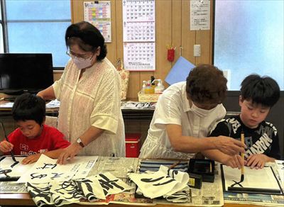 ⑤夏休みの宿題の習字。自治会サークル筆遊びの会の指導で頑張りました。 |