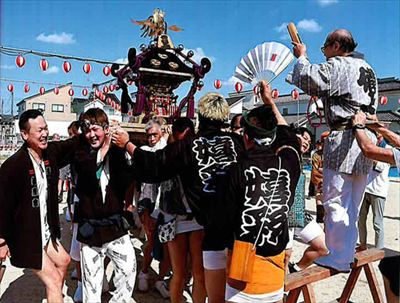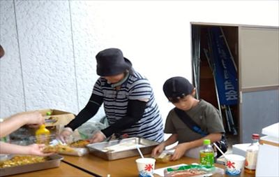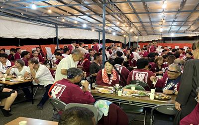 ⑤上記神輿パレード終了後、川久保自治会館庭の特設神酒所に戻り、約120人で夜食をごちそうになりコミュニケーションを図る。 |