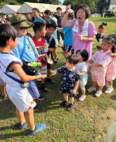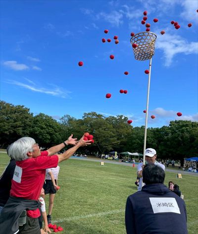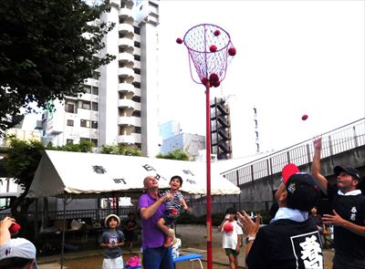 ⑤三世代交流夏の集いで町内会員の友人のイタリア人親子が始めて玉入れを経験したところ |