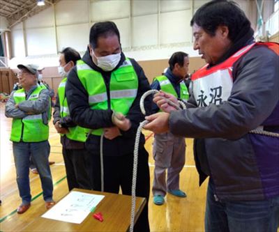 ①「身体もやい結びは、こうやって」合同防災訓練にて