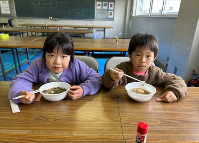 ⑤収穫した里芋の温かい山形風芋汁・手打ちそば・フランクフル・ドリンクト美味しく食べて大満足! |