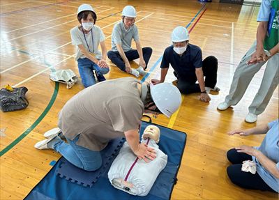 ⑤応急救護AED訓練:起震車による地震体験をはじめ救護訓練・消火訓練など総計200人が参加しました。疲れたー! |