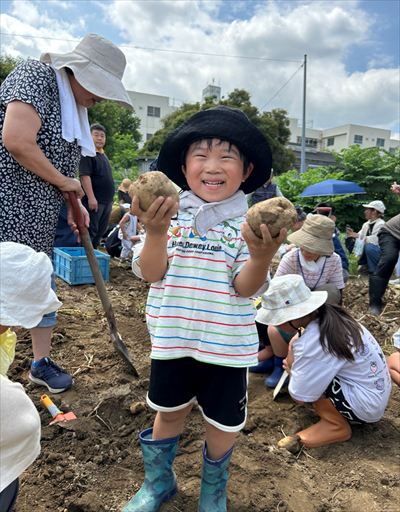 ⑤4月に植付をしたジャガイモが大きく成長し、184名が参加して、ジャガイモ掘りを楽しみました。 |