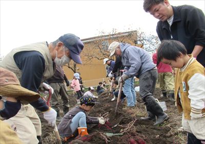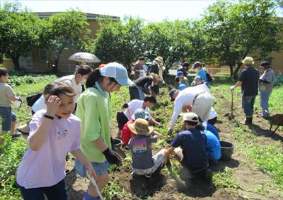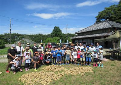 ⑤近隣の親子が大勢参加され、子供たちは手でイモを掘りながら現れたイモに目を輝かせて歓声を上げていました。なお収穫されたイモは、参加者等へのお土産、社会福祉協議会の「ココナツ便(ひとり親家庭の支援事業)」への寄付並びに安価販売と、地域の福祉の一助としても貢献しております。 |